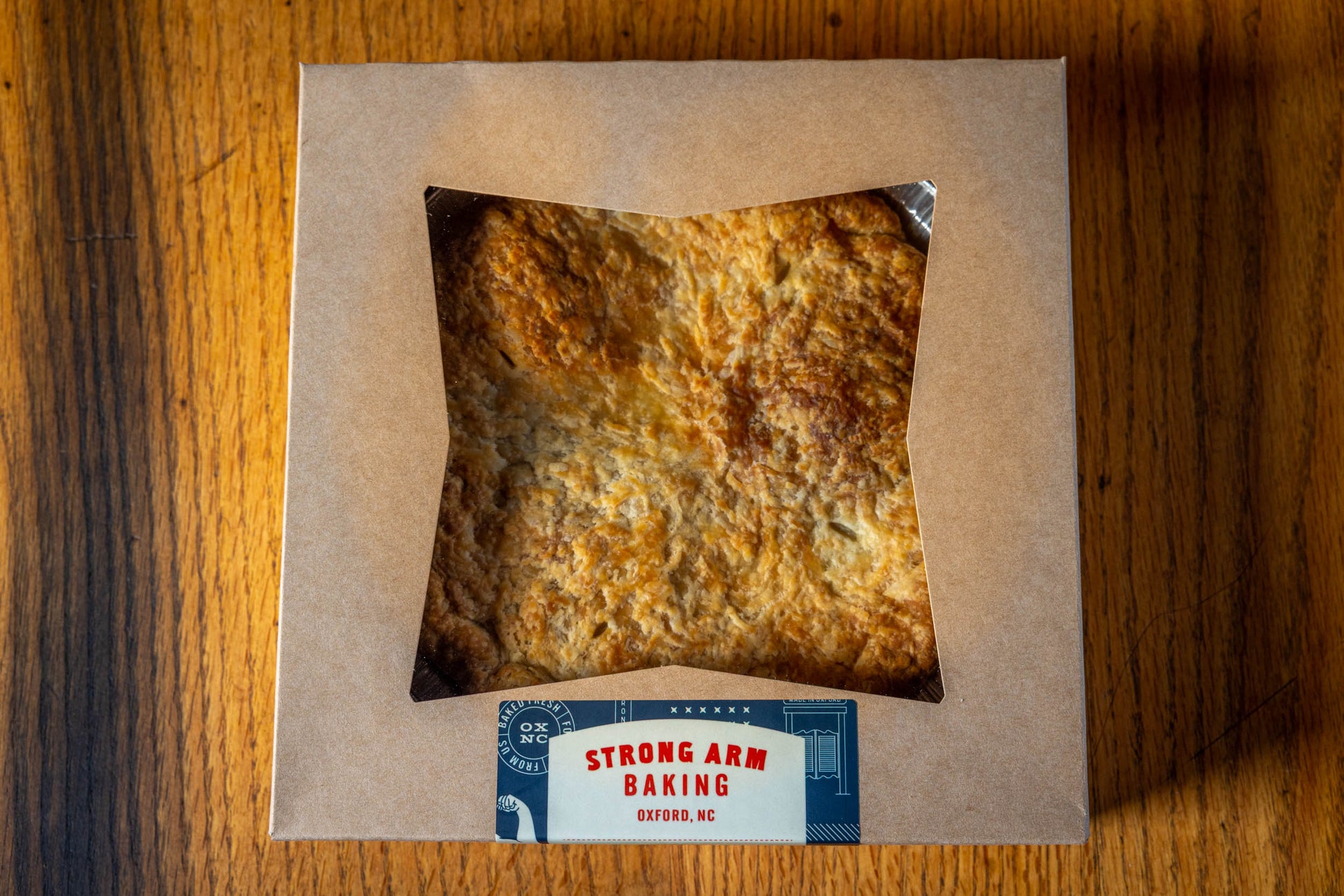 Chicken and gravy, with a handful of very finely chopped and roasted carrot and celery in our all butter pie pastry.