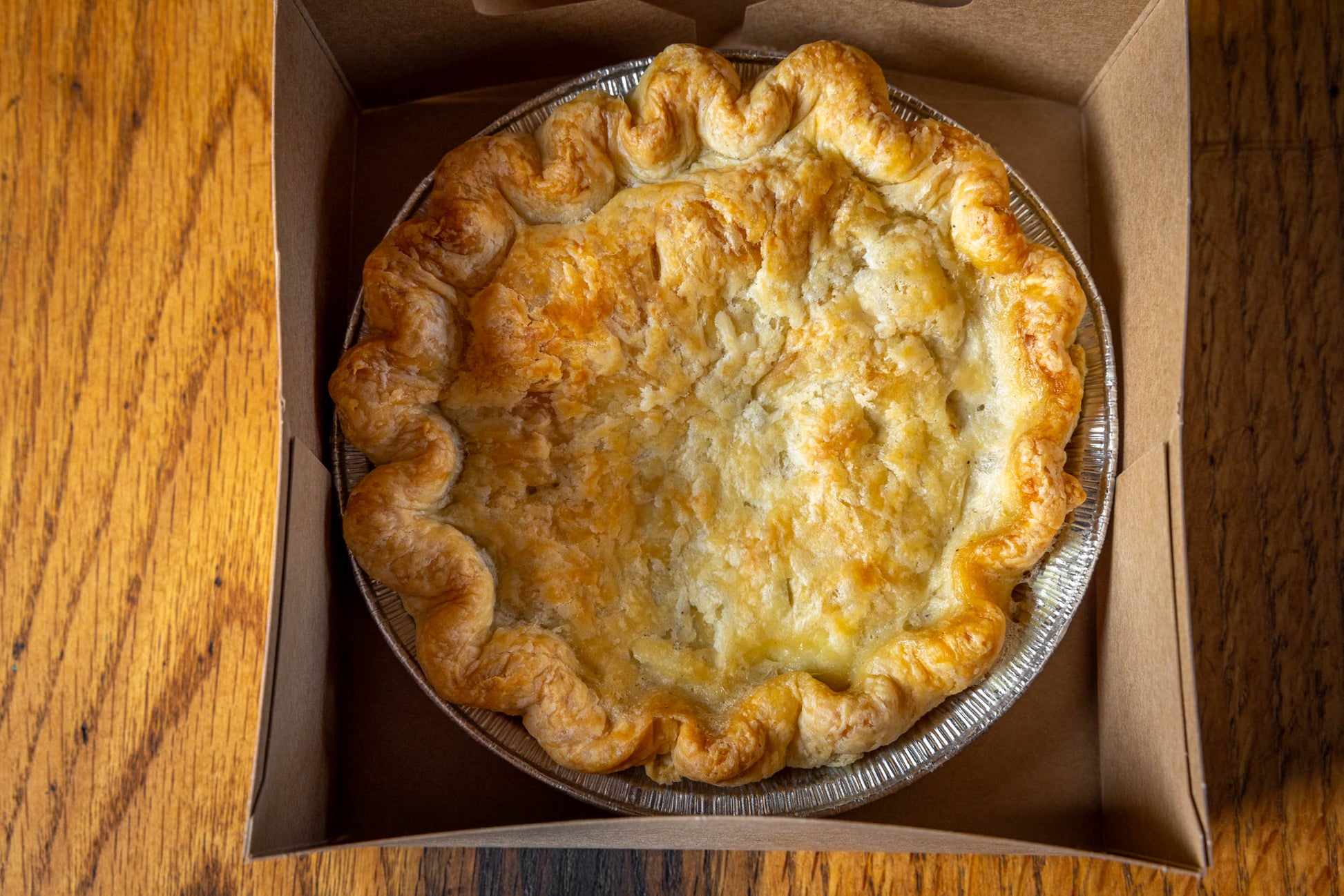 Chicken and gravy, with a handful of very finely chopped and roasted carrot and celery in our all butter pie pastry.