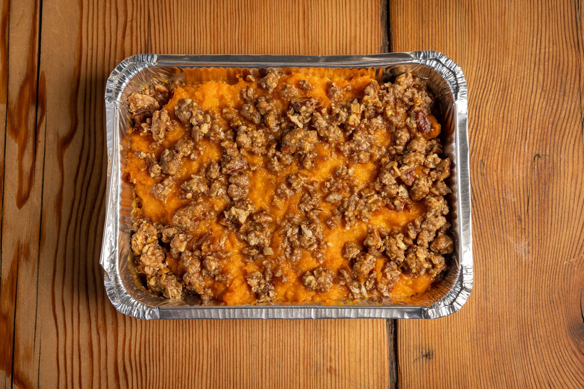 Granville country sweet potatoes roasted in their jackets, then pureed with a touch of maple and vanilla, sea salt and a little local cream. We let the sweet potatoes shine, not adding much in the way of extra sugar. Then we top the whole thing with a brown sugar pecan streusel (oats, buttery pecans, brown sugar and a few spices for a punch) for a crunchy contrast. Feeds 4-6.